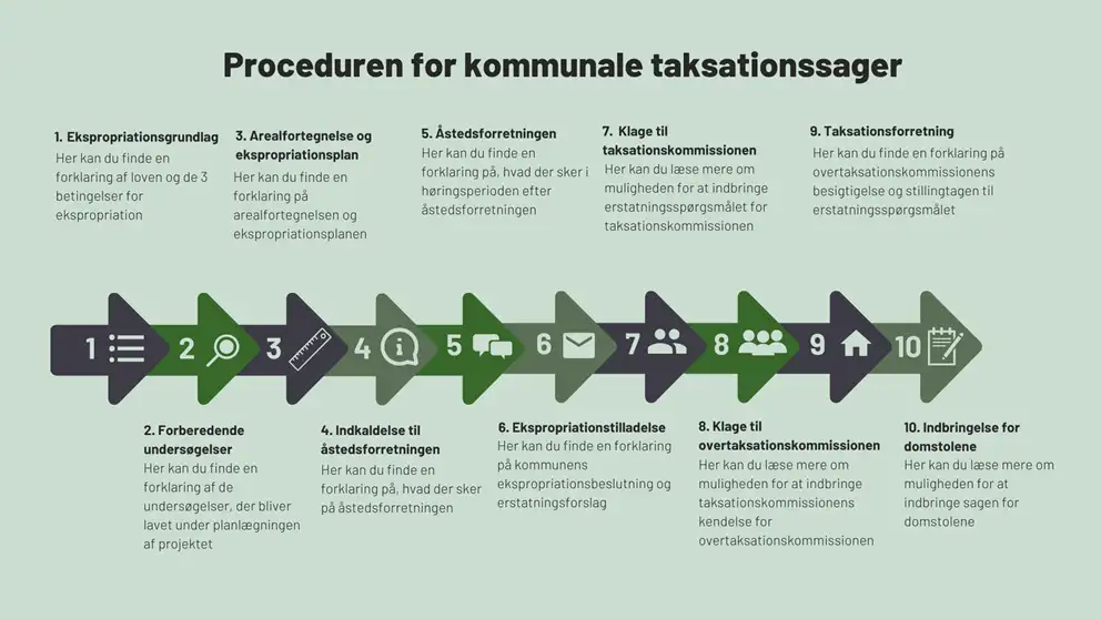 Hvis erstatningstilbuddet ikke accepteres, skal kommunen indbringe spørgsmålet om erstatning for taksationskommissionen senest 8 uger efter ekspropriationstilladelsen. Herefter behandler taksationskommissionen sagen og skriver en kendelse med deres beslutning, som sendes til parterne.