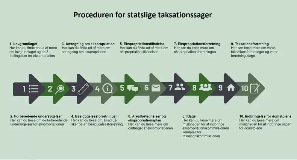 Ejendomsretten er beskyttet af Grundloven. Dog kan staten tvinge dem, der ejer ejendommen, til at afgive ejendomsretten mod erstatning, hvis 3 betingelser er opfyldt (herefter beskrevet som ekspropriation). De 3 betingelser, der skal være opfyldt for at foretage en ekspropriation er: 1) projektet, der eksproprieres til, skal komme samfundet til gode; 2) der skal gives fuld erstatning for ejendommen, der overtages; og 3) der skal vedtages en lov, som giver tilladelse til ekspropriationen. De efterfølgende skridt med projektet og ekspropriationen kan ikke begyndes, før loven er vedtaget.